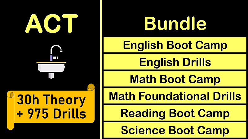 BundleVideo course. Replicates PrepAccelerator's LIVE boot camp. 6 modules. 103+ hours. 1] ACT English Boot Camp 2] ACT English Drills 3] ACT Math Boot Camp 4] ACT Math Part 1 of 2: Foundational Drills 5] ACT Reading Boot Camp 6] ACT Science Boot Camp.